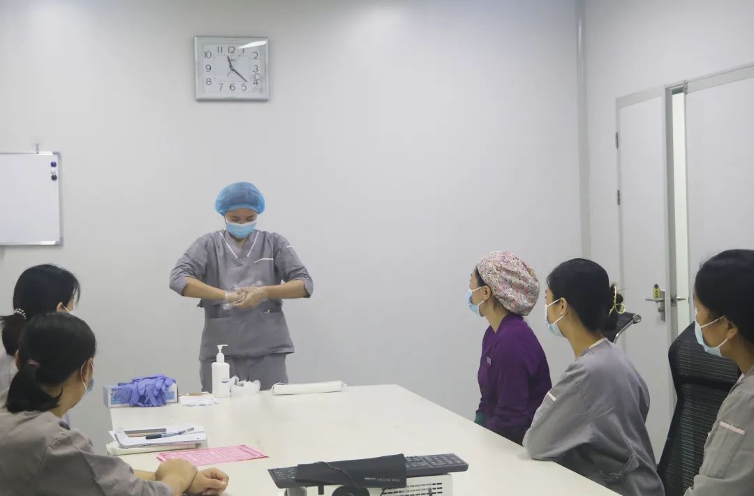 考核现场员工一一进行隔离衣穿脱,部门负责人以及教学组长进行点评,并对其中穿脱不合规的地方进行指导,以真正达到培训目的。