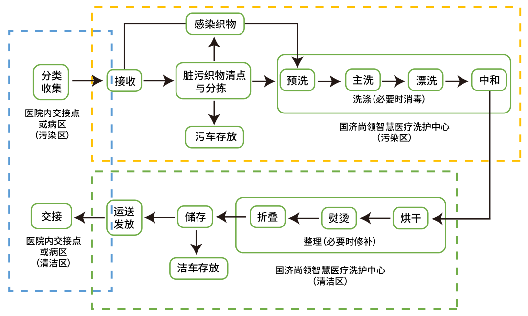 为使工作顺利有序地开展,洗护中心严格按照中华人民共和国卫生行业标准《医院医用织物洗涤消毒技术规范》工作流程要求执行。