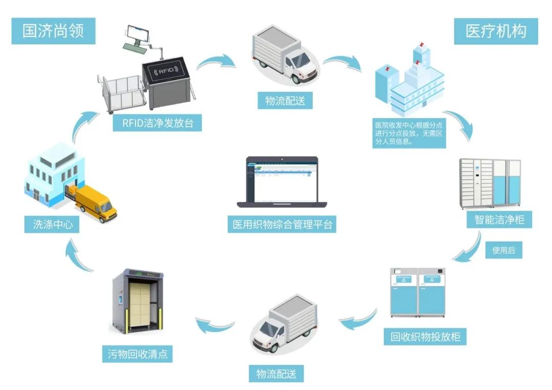 在国济尚领,每件医用织物都有自己专属的“身份证”——独立的芯片系统。作为医疗机构院感防控的重要环节物品,从医院开始装车到最后洗涤干净送回医院,中间任何过程都可随时查看。