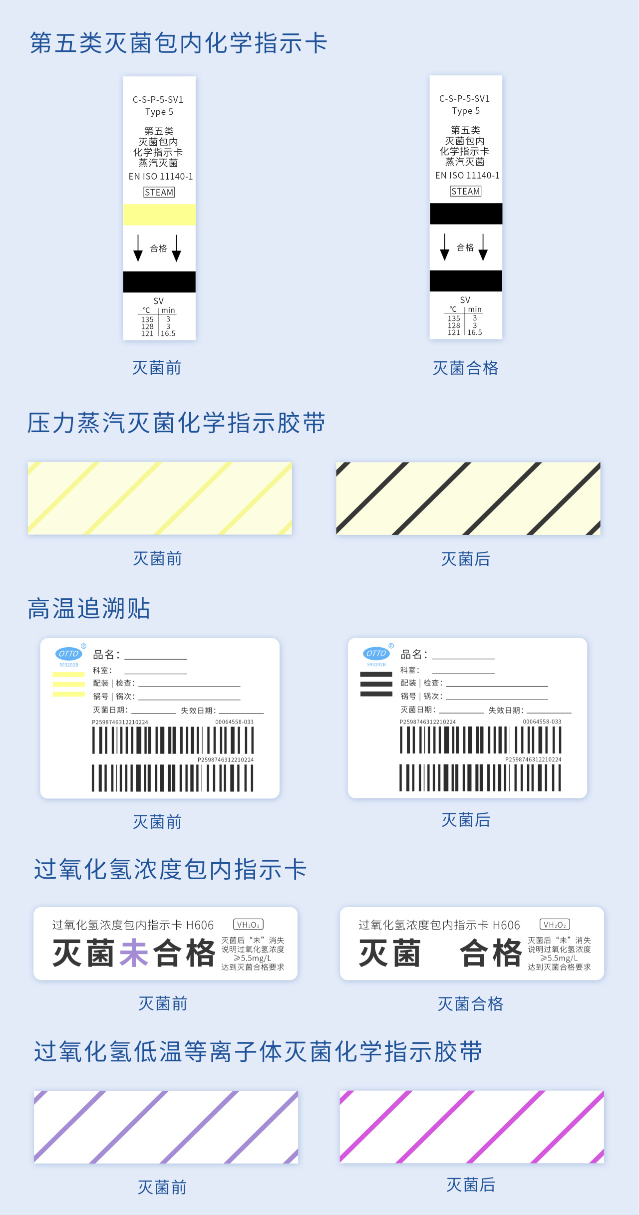 目前国济尚领消毒供应中心高温无菌包采用第五类灭菌包内化学指示卡、压力蒸汽灭菌化学指示胶带及高温追溯贴,低温无菌包采用过氧化氢浓度包内指示卡、过氧化氢低温等离子体灭菌化学指示胶带及低温追溯贴。