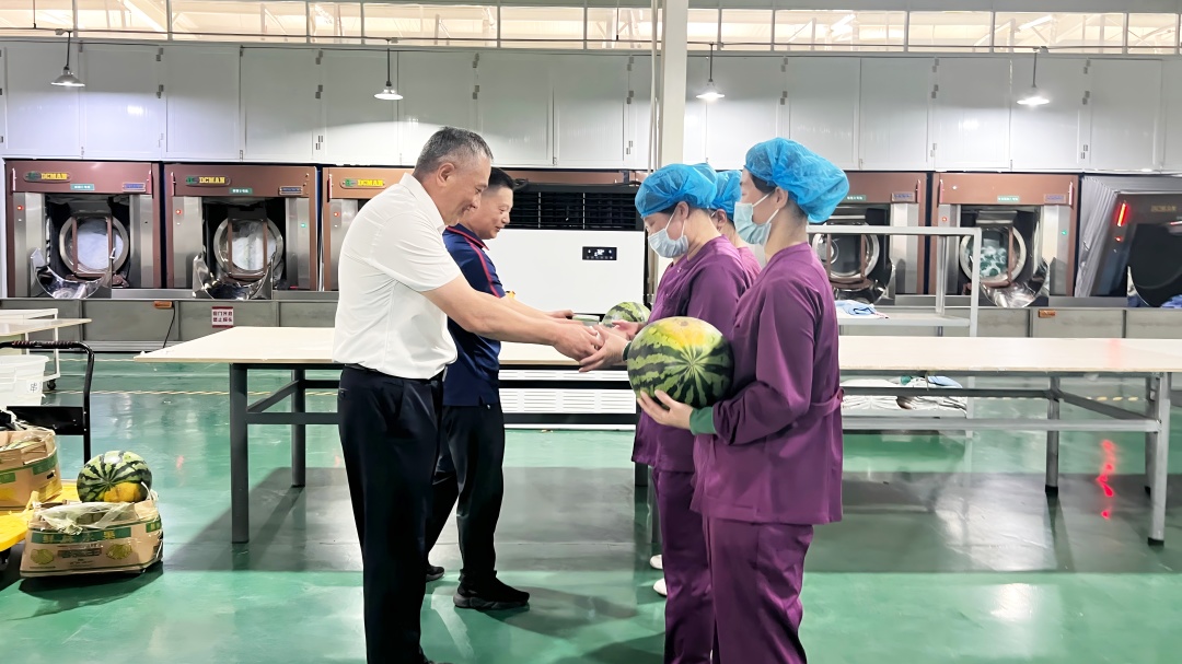 慰问团深入消毒供应中心、洗涤中心,看望奋战在高温一线的员工,将解暑物资送到大家手中,并与员工们亲切交谈,了解近期工作情况及高温防护措施落实情况。对大家顶酷暑、保运转的辛勤付出表示高度肯定。